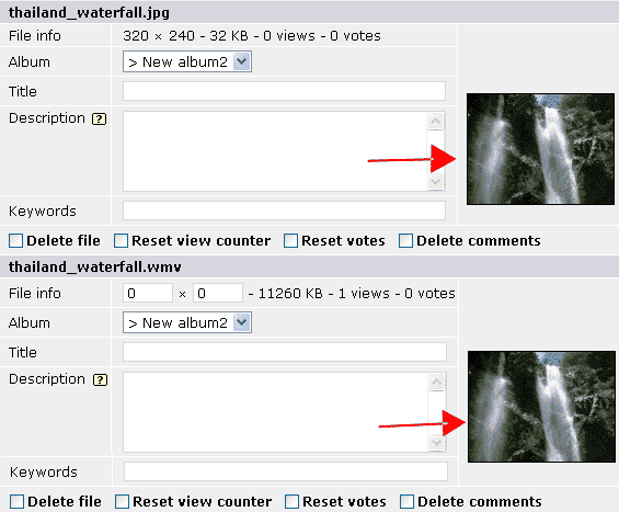 FTP upload both the video and (thumbnail or image) then batch-add. If you FTP upload the thumbnail, the thumbnail will be display in the batch add page instead of the default Coppermine thumbnail. If you upload an image it will look like the above screenshot. However, when the both files are added to the database, the thumbnail of the image will be used by the video.Note: If the first method is used and the image later deleted, the thumbnail will also be deleted and the default Coppermine thumbnails will be displayed, instead.